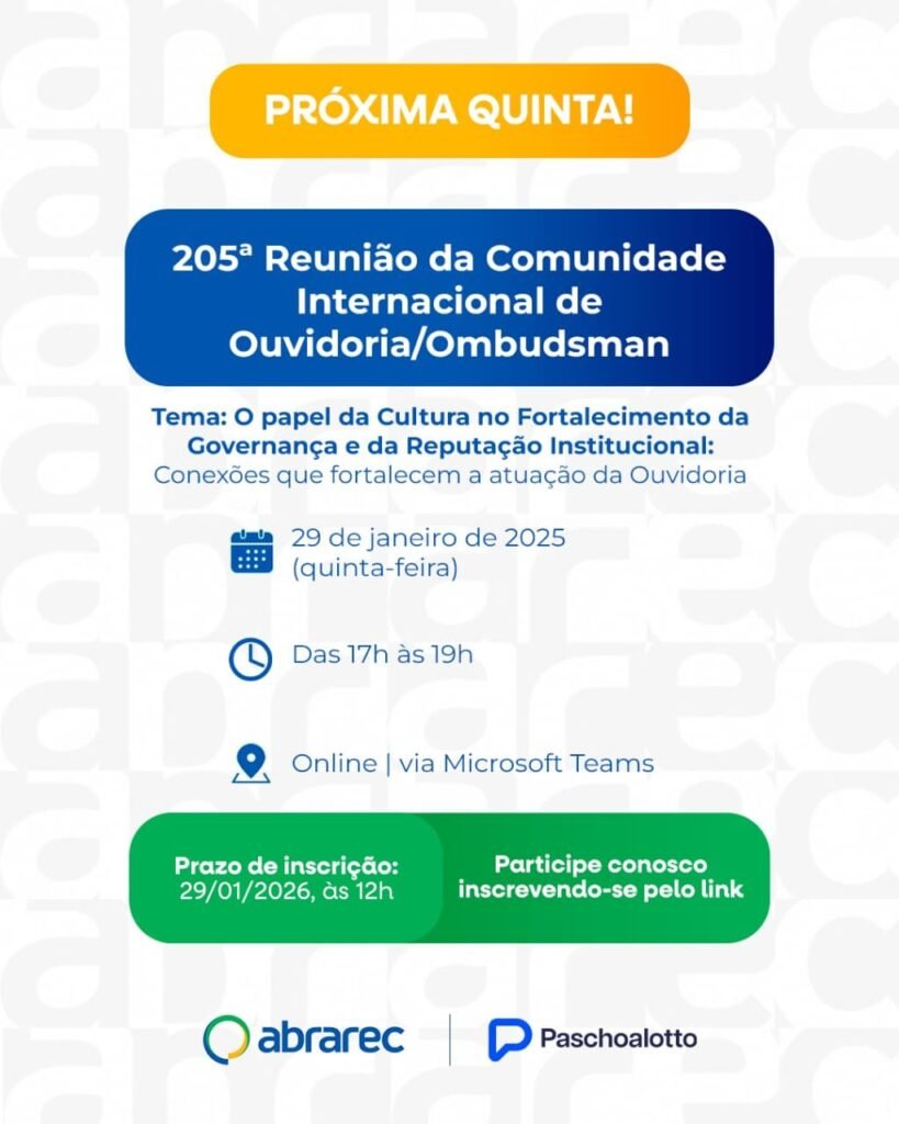 → 18h20 – Painel: “O papel da Governança no Fortalecimento da Cultura e da Reputação Institucional: Conexões que fortalecem a atuação da Ouvidoria”