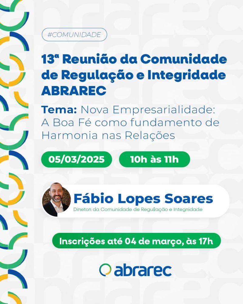 O professor Fábio Lopes Soares, Diretor da Comunidade de Regulação e Integridade vai trazer o debate sobre o tema de “Nova Empresarialidade: A Boa Fé como fundamento de Harmonia nas Relações”.
